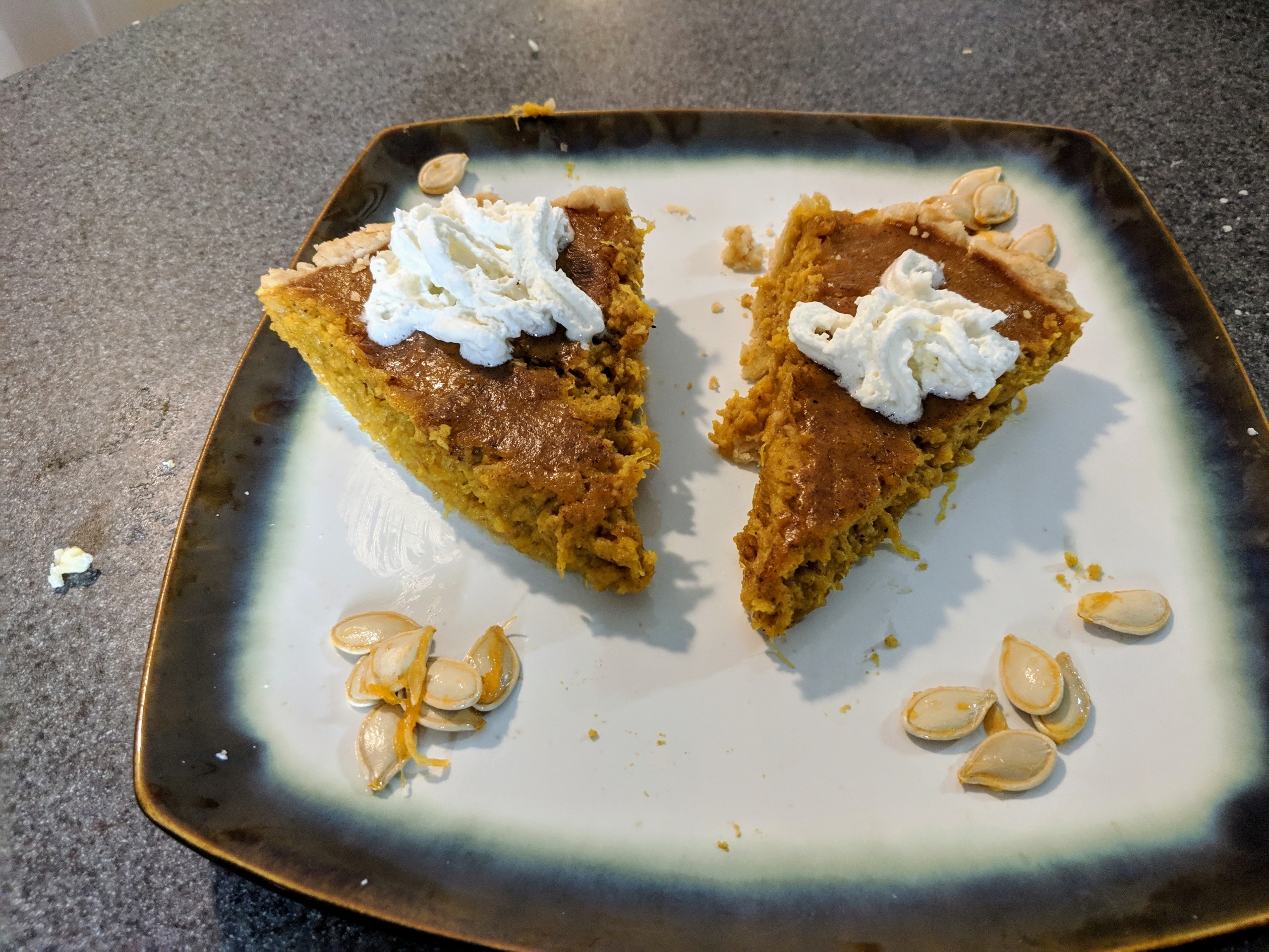 Cut stem off pie pumpkin and cut in half. Scoop out the seeds and stringy stuff.